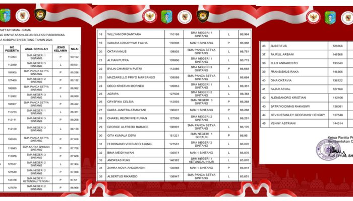 SINTANG, KN – Sebanyak 45 pelajar Kabupaten Sintang resmi dinyatakan lolos seleksi menjadi anggota Pasukan Pengibar Bendera Pusaka (Paskibraka) tahun 2025.