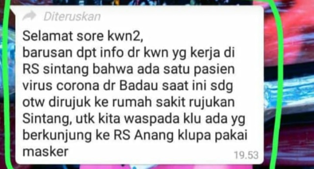 Menagggapi hal tersebut, Kadis Kesehatan Kabupaten Sintang, dr. Harsinto Linoh menyatakan bahwa tidak ada pasien dari Badau, Kapuas Hulu yang dirujuk ke Rumah Sakit Ade M Djoen Sintang, karena virus corona dan itu berita bohong atau Hoax.