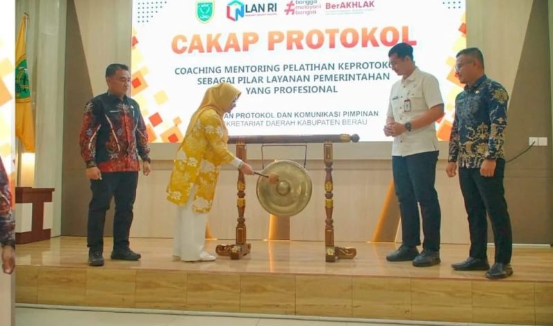 BERAU, KN – Bupati Berau, Sri Juniarsih Mas, secara resmi membuka kegiatan Pelatihan Keprotokolan bertajuk Cakap Protokol yang digelar di Balai Mufakat, Kamis (18/09/2025). Pembukaan ditandai dengan pemukulan gong sebagai simbol dimulainya kegiatan.