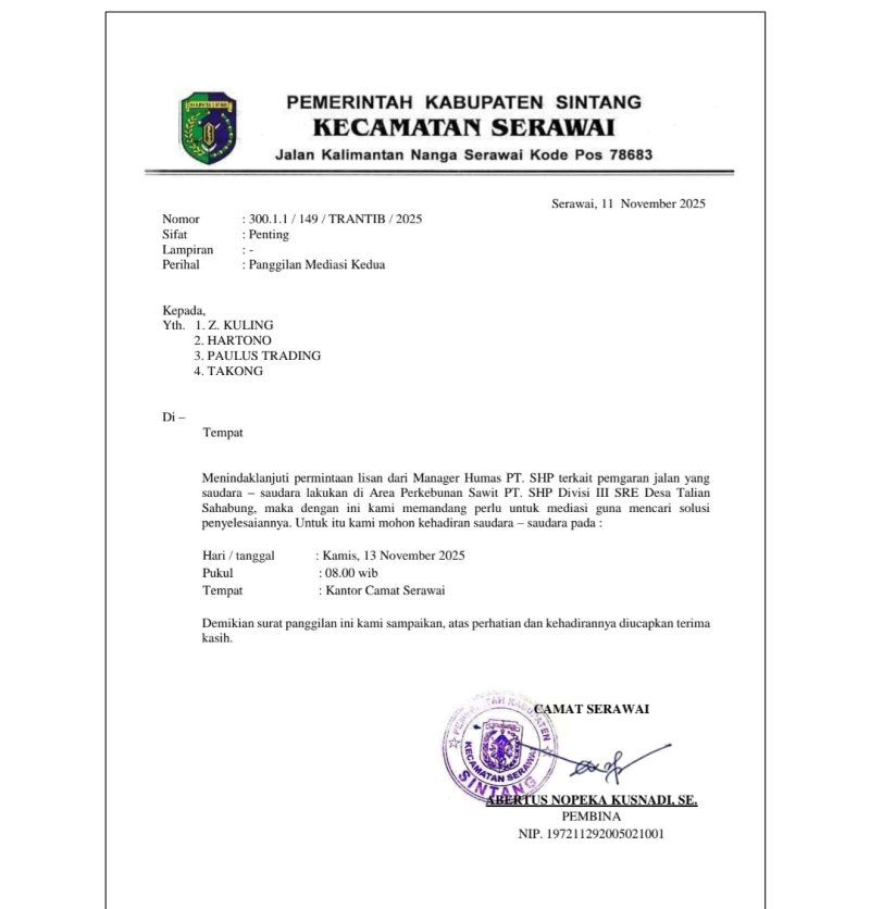 Surat tersebut memanggil empat pihak — Z. Kuling, Hartono, Paulus Trading, dan Takong — untuk hadir dalam mediasi pada Kamis, 13 November 2025 di Kantor Camat Serawai.