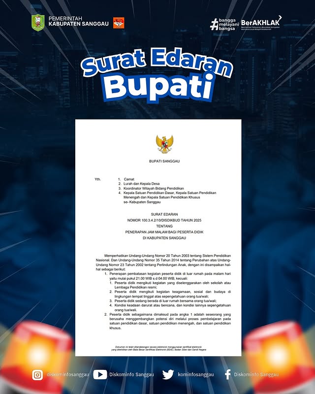 SANGGAU, KN – Pemerintah Kabupaten Sanggau melalui Dinas Pendidikan dan Kebudayaan telah mengeluarkan Surat Edaran Nomor 100.3.4.2/10/DISDIKBUD Tahun 2025 tentang Pemberlakuan Jam Malam bagi…