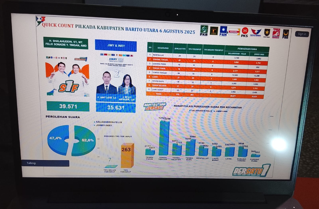 MUARA TEWEH, KN ( 6 Agustus 2025) – Hasil perhitungan cepat (quick count) dari 267 Tempat Pemungutan Suara (TPS) menunjukkan pasangan calon Shalahudin–Felix (S1F)…