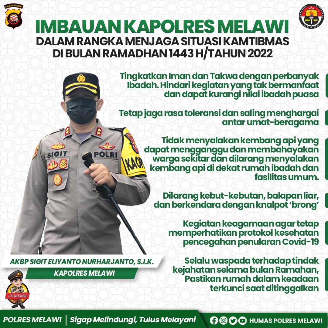 MELAWI, KN – Menjelang bulan suci Ramadhan 1443 Hijriah, Kapolres Melawi AKBP Sigit Eliyanto Nurharjanto, S.I.K. mengeluarkan imbauan kamtibmas. Hal itu dimaksudkan untuk menjaga…