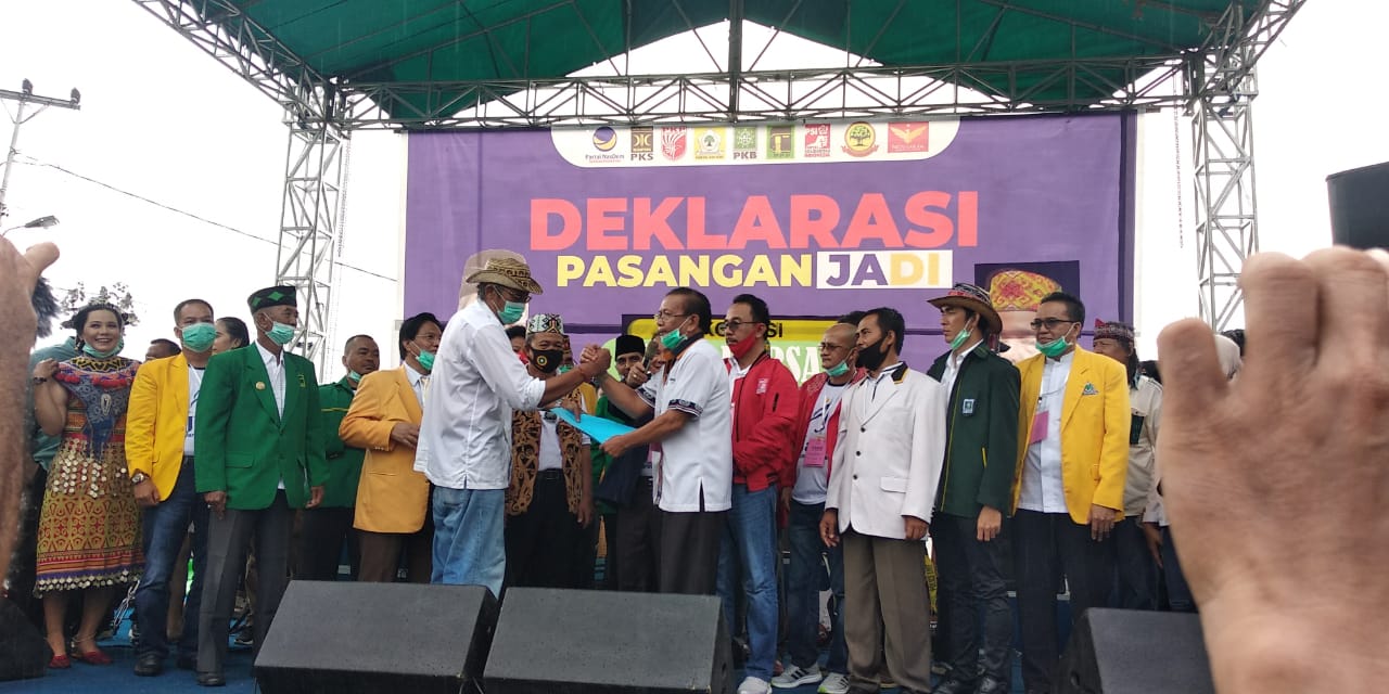 SINTANG, KN – Koalisi Adil Bersatu mendeklarasikan pasangan bakal calon Bupati dan Wakil Bupati Sintang, Jarot Winarno – Yosef Sudiyanto di halaman Indoor Apang…