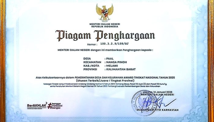 BOYOLALI-KN. Desa Paal, Kecamatan Nanga Pinoh, Kabupaten Melawi, Provinsi Kalimantan Barat, meraih Penghargaan Pemerintahan Desa dan Kelurahan Award Tingkat Nasional Tahun 2025 dari Kementerian Dalam Negeri Republik Indonesia.