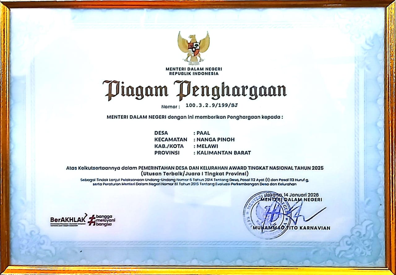 Melalui penghargaan ini, Desa Paal diharapkan dapat menjadi contoh bagi desa-desa lain di Kabupaten Melawi dan Kalimantan Barat dalam mewujudkan pemerintahan desa yang profesional, transparan, dan berorientasi pada kesejahteraan masyarakat. (Ira)