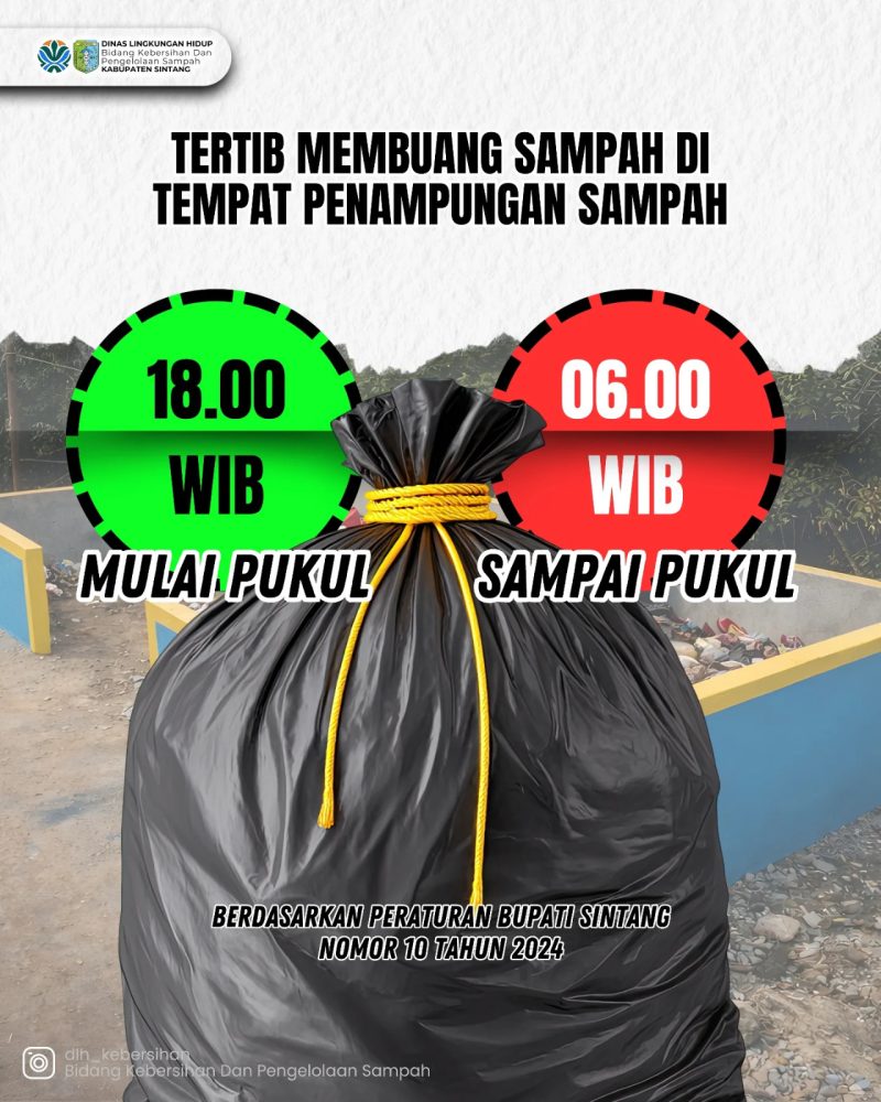 SINTANG, KN – Dinas Lingkungan Hidup Kabupaten Sintang (DLH) Kabupaten Sintang membuat gebrakan baru dalam upaya meningkatkan pengelolaan sampah di wilayah perkotaan. Memasuki tahun 2026, DLH akan mulai menerapkan kebijakan pembatasan jam buang sampah sebagaimana diatur dalam Peraturan Bupati (Perbup) Nomor 10 Tahun 2024 tentang pemberlakuan jam buang sampah.