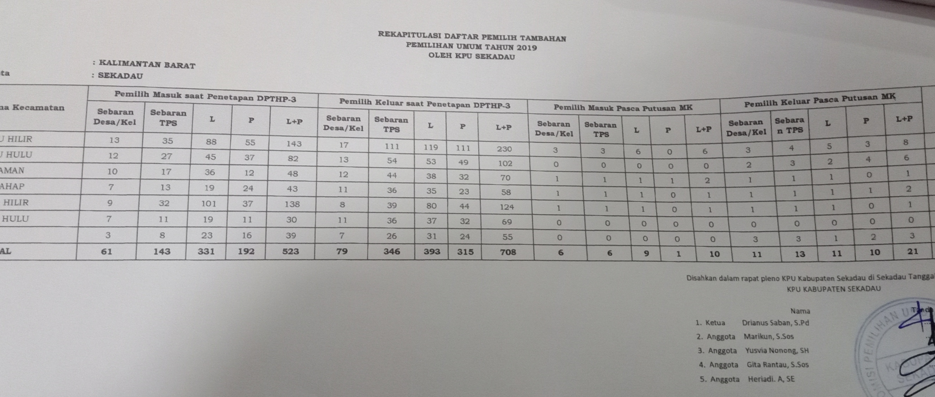 Ia menyampaikan bahwa, daftar pemilih tambahan Kabupaten Sekadau pemilu 2019, pemilih masuk pasca keputusan MK, yakni, sebaran desa 6, sebaran TPS 6, laki+perempuan 10 dan pemilih keluar pasca putusan MK, sebaran desa 11, sebaran TPS 13, laki+perempuan 21.